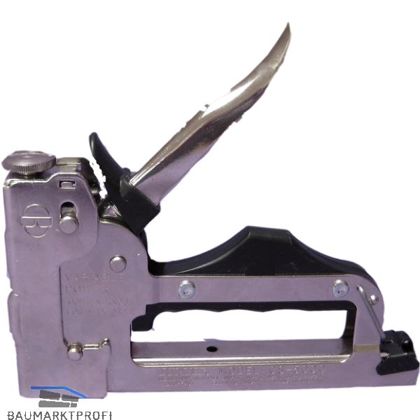 Robuster Handtacker zum Gebrauch für viele Befestigungsarbeiten in Industrie-, Bau-, Dekorationsbetrieben, Möbelfabriken, Tischlereien usw.Mit verstellbarer Schlagstärke.