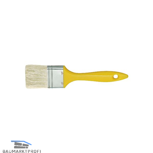 Borstenmischung aus heller Borste und hohlem fein geschlitztem Polyester, verzinkte Zwinge, gelber Kunststoffstiel. Geeignet für einfache Anforderungen bei Grundierungen, Lasuren, wasser- und lösemittelbasierenden Farben.