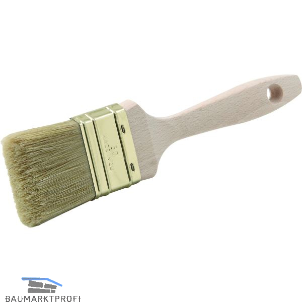 Borstenmischung aus heller Borste und konischem Polyester, vermessingte Zwinge und Holzstiel. Geeignet für Wandfarben, lösemittelbasierende Farben und Lacke, exaktes Beschneiden auch nach langem Einsatz möglich.