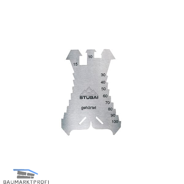 Rostfreier, gehärteter Edelstahl, blank poliert. Maßeinteilung geätzt, von 5 - 100 mm in 5 mm-Schritten, gehärtet auf 48 HRC.