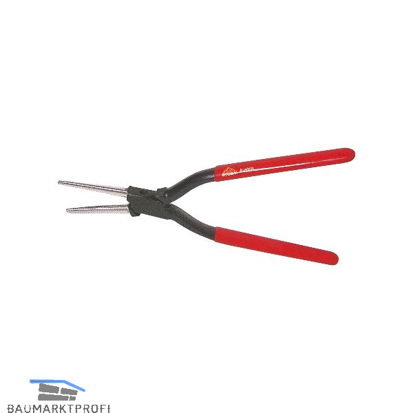 Günstige Hebelübersetzung, geschmiedet, hohe Kraftübertragung durch die 45 mm Spitzen, Spitzen induktiv gehärtet und leicht abgerundet, Schenkel rot kunststoffbeschichtet. Werkstoff: C45 Kohlenstoffstahl, Zangenspitzen mit Zahnung.