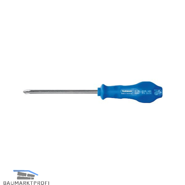 Kreuzschlitz-Schraubendreher mit vernickelter Klinge und blauem Polypropylen-Heft.