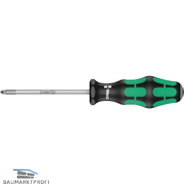 Rundklinge, Kraftform-Griff (mit Hart- und Weichzonen) mit Abrollschutz und Größenkennzeichnung. Die Laserbehandlung der Klingenspitze (Lasertip) schafft eine microraue Oberfläche, die sich im Schraubenkopf förmlich festbeißt.