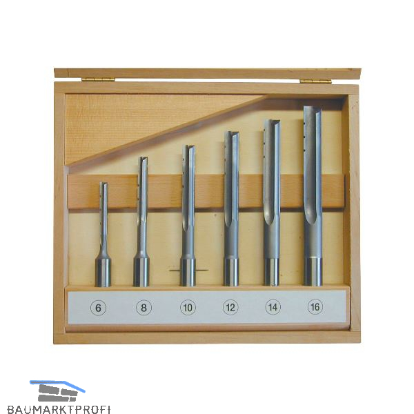 Zusammenstellung der wichtigsten Langlochbohrer. Rechtslauf mit Spanbrechern und geraden Schneiden. Lieferung in Holzkassette.