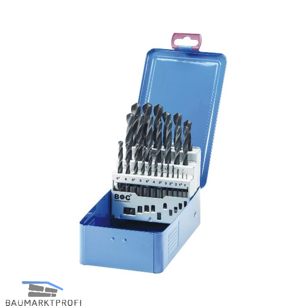 Marke: Bohrcraft Bohrer ø von bis (mm): 1 - 13 Satzgröße: 25-tlg. DIN: 338 RN Aufnahme: Zylinderschaft Material: HSS Ausführung: Spitzenwinkel 118° und Kegelmantelanschliff