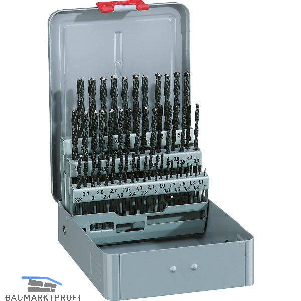 Kassette aus Stahlblech, lackiert. Spiralbohrer präzisionsgeschliffen mit Zylinderschaft. Industriequalität zum Bohren von legierten und unlegierten Stählen, Grauguss, Temperguss, Kupferlegierungen, Neusilber, Graphit, Sintereisen. Kein Ankörnen, durch Spezialanschliff, ø um 0,1 mm steigend.