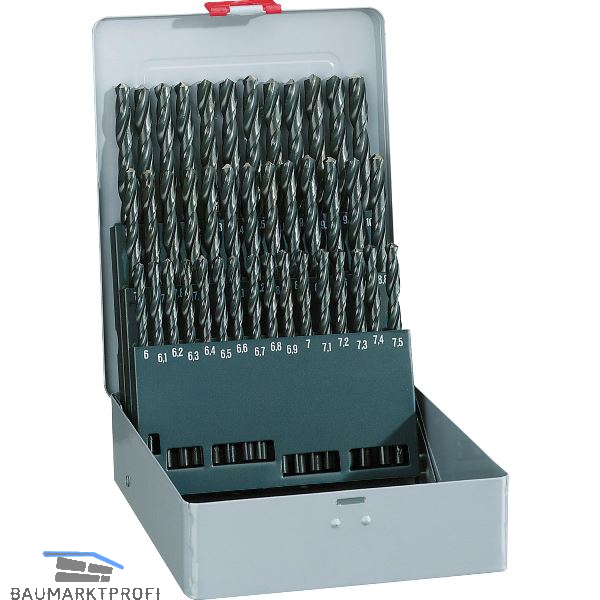 Kassette aus Stahlblech, lackiert. Spiralbohrer präzisionsgeschliffen mit Zylinderschaft. Industriequalität zum Bohren von legierten und unlegierten Stählen, Grauguss, Temperguss, Kupferlegierungen, Neusilber, Graphit, Sintereisen. Kein Ankörnen, durch Spezialanschliff, ø um 0,1 mm steigend.