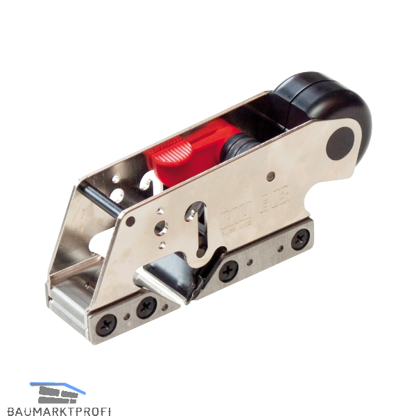 Ein praktischer kleiner Einhand-Fausthobel zum schnellen Nachputzen von Fälzen, Kanten, Stirnseiten usw. Mit auswechselbarem Wendemesser (zweischneidige Klinge). Die Maulbreite ist mittels beigelegtem Schlüssel verstellbar, die Schnitttiefenverstellung erfolgt stufenlos durch Exzenterhebel.