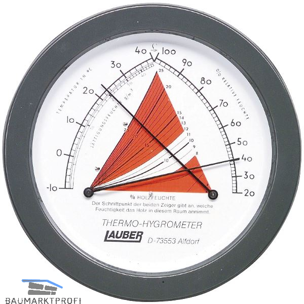 Im Schnittpunkt der Zeiger ist die Holzgleichgewichtsfeuchte abzulesen. Dieser Wert ist ausschlaggebend für das Schwinden und Quellen des Holzes.
