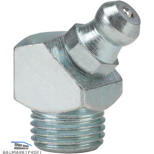 Nach der Norm-Vorschrift aus Stahl, glanzverzinkt und gehärtet. Alle Gewinde sind kegelig. Winkel-Schmiernippel besitzen eingeschraubte Schmierköpfe.
