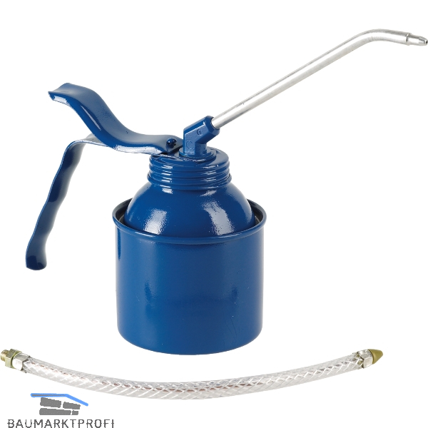 Mit Messing-Druckpumpe. Starkwandiger Stahlblechbehälter blau einbrennlackiert. Abgewinkelte Spritzrohrverbindung ermöglicht das Ölen von schwer zugänglichen Stellen.