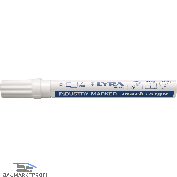 Lackmalstift mit Kegelspitze, Strichbreite 3 mm. Wasserfest, bestens geeignet für Markierungen auf allen glatten und porösen Oberflächen. Tinte schnell trocknend und schwer entfernbar. Frei von Xylol und Toloul.