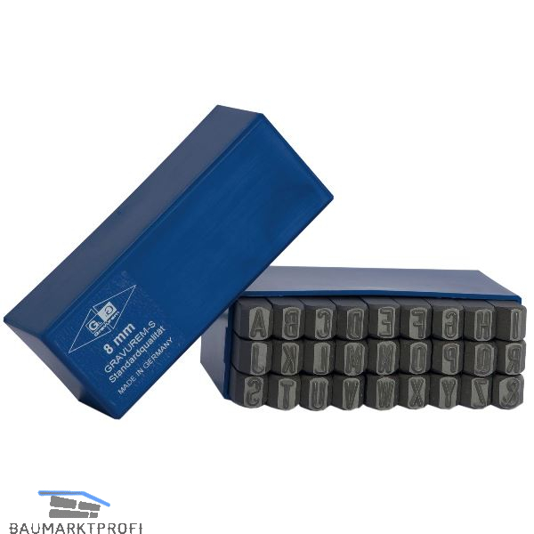 Zum Einschlagen in Werkstücke mit einer Festigkeit 120 kp/mm². Schriftbild nach DIN 1451. Mit Sichtgravur in bruchsicheren Kunststoffdosen.