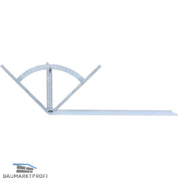 Aus Edelstahl, rostfrei, cm-Skalen auf dem Waage- und Senkriss mit Anreißlöchern am kurzen Schenkel.Skalen geätzt.Gradteilung 0 - 90°.