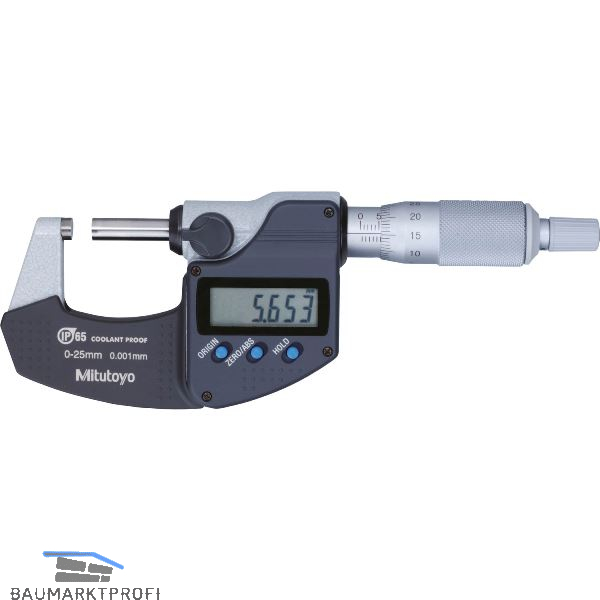 Bügelmessschraube mit Ratsche, Skalentrommel und Skalenhülse mattverchromt, Messflächen HM-bestückt, geschliffen, feinstgeläppt. Automatische Abschaltung, Alarm bei niedriger Spannung, Tastensperrfunktion. Schutzart IP 65.