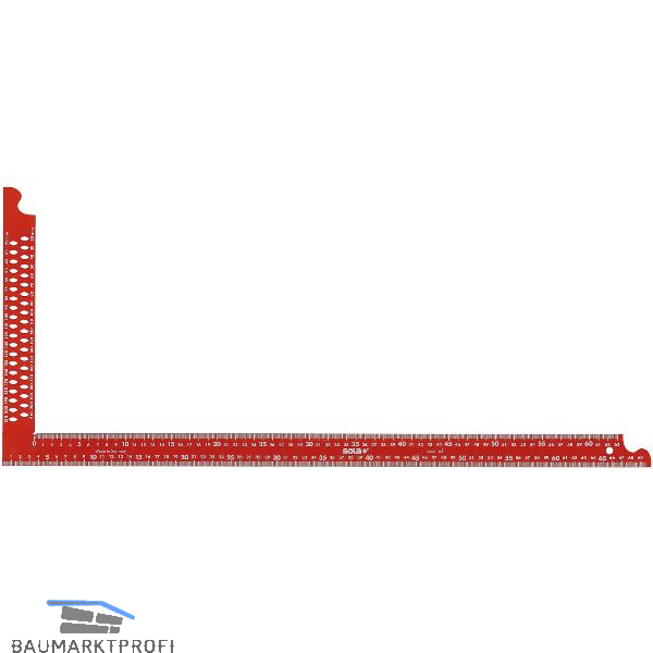 Zimmermannswinkel aus Stahl, rot pulverbeschichtet mit Anreißlöchern in 0,5 cm Schritten. Schmutzabweisende Beschichtung, Anreißlöcher zur Übertragung von Distanzen. Hoch elastisch und bruchfest. VPA geprüft.
