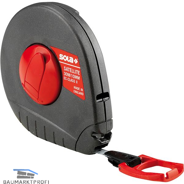 Kapsel aus hochfestem Kunststoff, weißlackiertes Stahlband, multifunktioneller arretierbarer Endhaken (Haken mit Ösen für Nagel, Kralle zur Zugmessung, Stahlkralle zum Eindrücken in Holz und Gipskartonplatten).