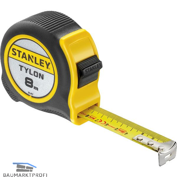 Band vollständig mit "Tylon"-Polymer-Schutzschicht überzogen, Endhaken dreifach ab 8 m, zweifach bis 5 m vernietet, verschiebbar für Innen- und Außenmessung, robustes Kunststoffgehäuse, schlagfest, gummiert, Gürtelclip, automatischer Bandeinzug mit Rücklaufsperre.