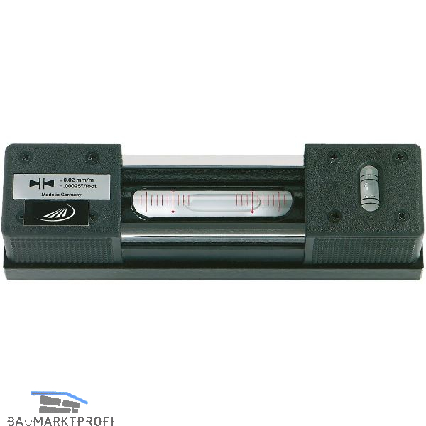 Gehäuse aus Spezialguss, prismatische Sohle, Längs- und Querlibelle. Handwärme-Isolierung, Schutzglas über der Libelle, im Holz-Etui.