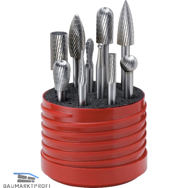 Für Stahl und Stahlguss, legiert und unlegiert.Inhalt: 10 St. Frässtifte (Form/Abmessungen in mm): A/6 x 16, A/12 x 25, C/12 x 25, D/4 x 3, D/12 x 10, E/12 x 20, G/13 x 30, H/12 x 30, K/6 x 20, M/6 x 18.