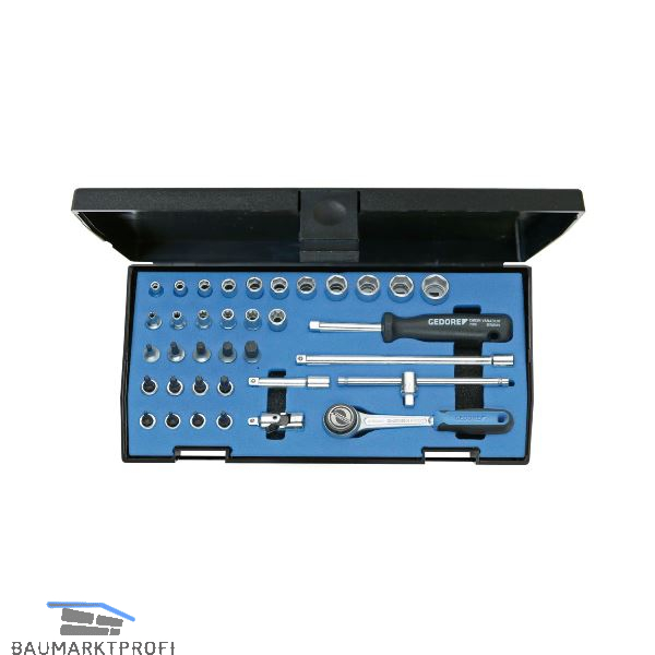 Mit geschmiedeten, vergüteten 6-kant Einsätzen und Betätigungswerkzeugen in Kunststoffkassette, mit PUR-Einlage.