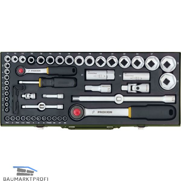 Zubehör: 1/4": Verlängerung 50 mm, Verlängerung 150 mm (komb. m. Gleitstück), Kardangelenk, Vierkant-Griff; 1/2": Verlängerung 60 mm, Verlängerung 250 mm (komb. m. Gleitstück), Kardangelenk, Zündkerzenspezialeinsätze 16, 21 mm; Stiftschlüssel 1.25, 1.5, 2.0, 2.5.