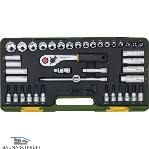 In Standardqualität mit 6-kant Einsätzen und Betätigungswerkzeugen in Kunststoffkassette.
