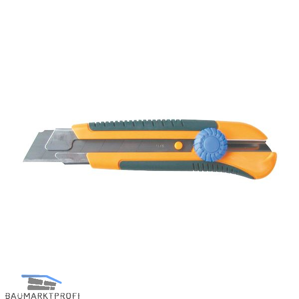 Stabile Gewerbeausführung mit Abbrechklinge. Heft aus Kunststoff mit geriffelten Gummieinlagen und Fixierrändelschraube. 1 mm starke Stahlklingenführung.
