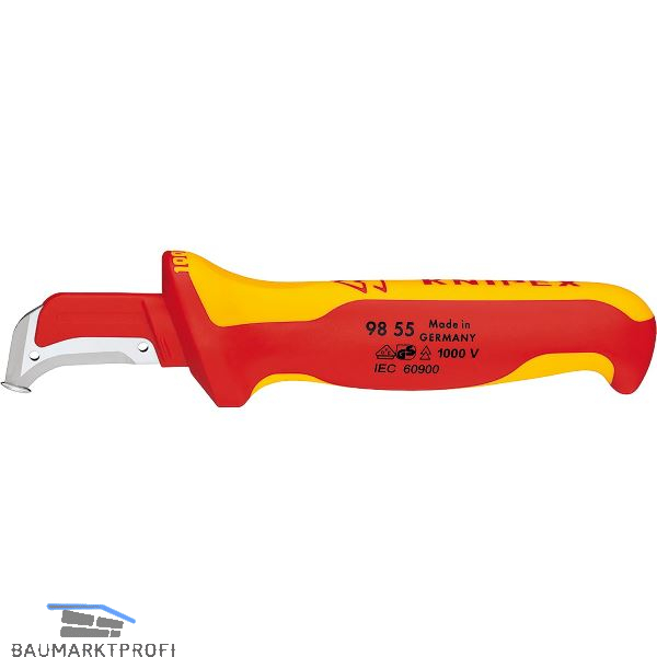 Ergonomisch, isolierender Mehrkomponenten-Griff, mehr Sicherheit durch rutschfeste Weichkomponente, gute Kraftübertragung beim Ziehen des Messers durch Daumenmulde und "Fingerhaken" am Griffende, transparente Schutzkappe.
