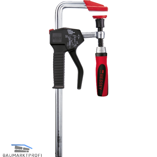 Hochwertiger 2-Komponenten-Kunststoffgriff, wechselbare Druckplatten. In einem Griff Fixieren mit dem Spannhebel, ohne Umsetzen Festspannen und Lösen wie üblich über den 2 - Komponentengriff. Schiene, Festbügel und Druckplatte in einem Stück aus Profilstahl. Der ergonomisch geformte Griff mit Pumphebel läuft parallel zur Schiene. Spannkraft bis zu 5.000 N.