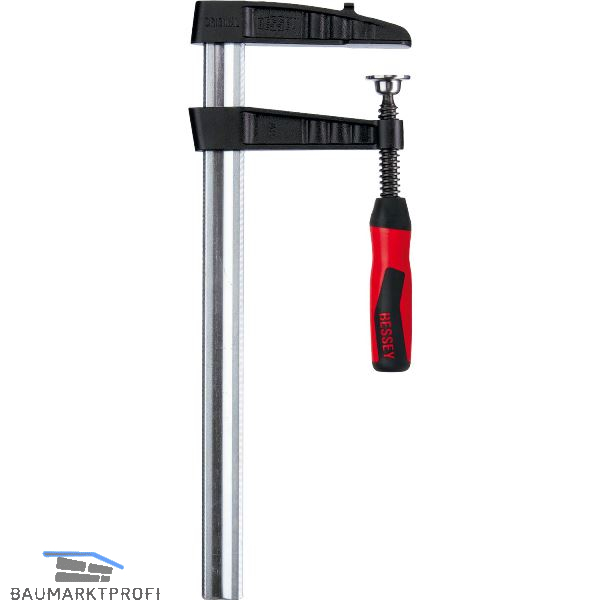 Werkzeuglos wechselbare Druckplatten. Schraubzwingen mit Tempergussbügeln. Profilierte Stahlschienen bringen hohe Festigkeit, gute Gleitfähigkeit und verhindern ein Abrutschen des Gleitbügels. Ab 80 mm Ausladung, mit Rutschsicherung. Das Gewinde des im Gleitbügel eingebauten Gewindestiftes greift beim Verkanten in die Riffelung der Schiene. Spannkraft bis zu 7000 N.