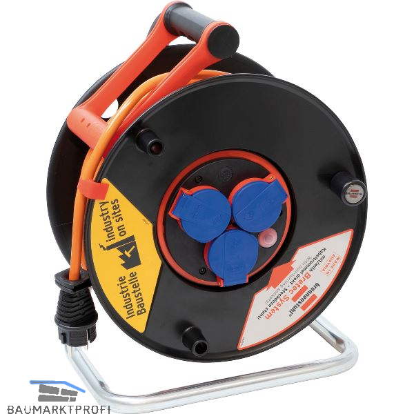 Extra stabiles und verzinktes Stahlrohrgestell mit hoher Standfestigkeit und erhöhter Schutz des Trommelkörpers gegen Beschädigung, robuster und breiter Tragegriff mit komfortabler Kabelführung für sicheres Aufrollen. 3 Schutzkontakt-Steckdosen, spritzwassergeschützt, mit selbstschließenden Deckeln und Bretec® Drehkontakt-Technik für rationelles Arbeiten. (Während Sie die Trommel drehen, bleibt die Steckdoseneinheit mit den angeschlossenen Geräten stehen). Trommelkörper aus Breflex-Spezialkunststoff mit verstärkten Rippen, Überhitzungsschutz, Kontrollleuchte bei Überhitzung und Überlastung.