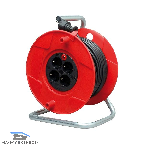 Trommelkörper aus Breflex-Spezialkunststoff auf verzinktem Tragegestell, ergonomischer Handgriff mit Achse für perfekte Kabelführung beim Auf- und Abrollen, Überhitzungsschutz, Kontroll-Leuchte bei Überhitzung und Überlastung.