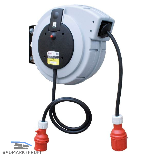 Automatischer Kabelaufroller für Gewerbe, Landwirtschaft und Industrie, mit 16A Euro-Stecker und Steckdose (400V), schlagfestes Gehäuse, mit stabiler Wand- bzw. Deckenaufhängung aus Stahl, abschaltbare Blockiervorrichtung, starke Rücklauffedern aus Spezialstahl, GI-Kabel mit Querschnitt 2,5mm².