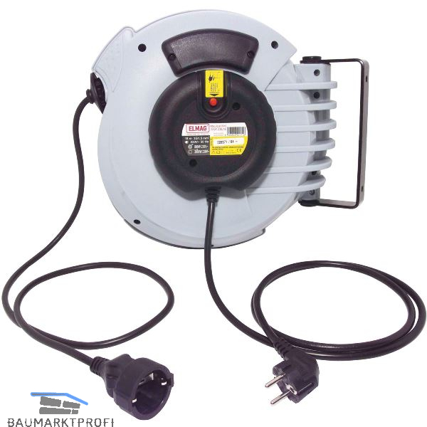 Schlagfestes Gehäuse, schwenkbar gelagert auf stabiler Wand- bzw. Deckenaufhängung aus Stahl, mit Schuko-Stecker und Steckdose, abschaltbare Blockiervorrichtung, starke Rücklauffeder aus Stahl, thermischer Überlastschutz.