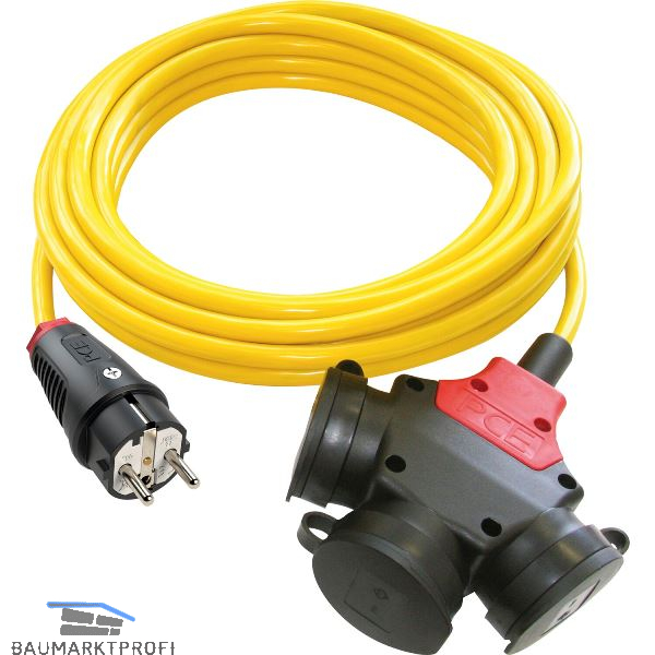 PVC-Baustellenleitung gelb, mit montiertem Gummistecker und 3-fach Gummihängekupplung mit Schnappdeckel 16A 250V.