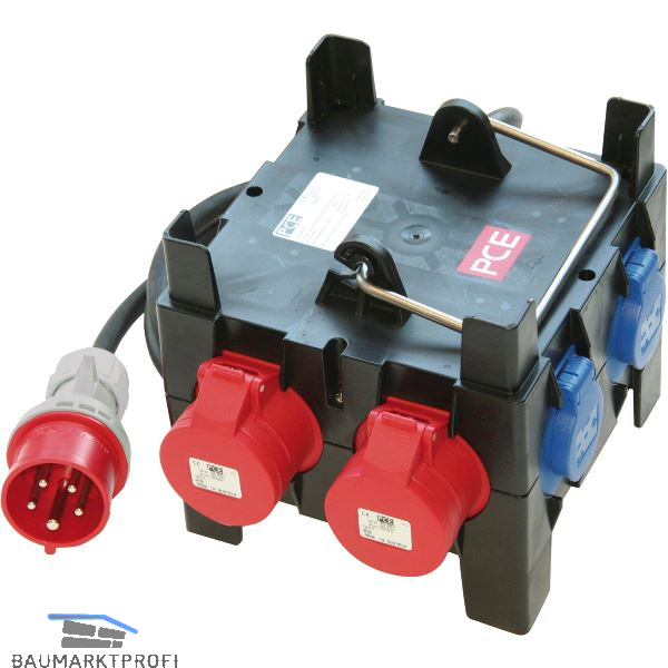 Ausgangsleistung: 2 CEE-Dosen 16A 5p 400V ungesichert, 5 Schutzkontaktsteckdosen 16A/250 ungesichert