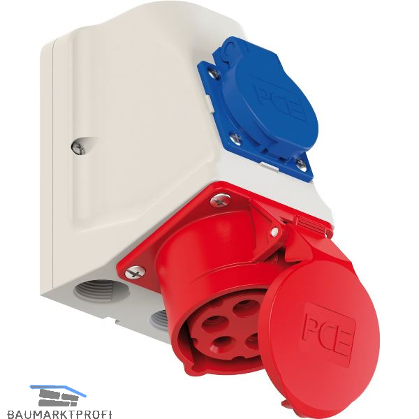 Wanddose mit integrierter Schutzkontaktsteckdose, Anschlussklemmen bis 10 mm², fertig verdrahtet, Leitungseinführung oben, unten oder hinten, bei 32A, Schutzkontaktsteckdose abgesichert, Sicherung (10A träge), inkl. Würgenippel.
