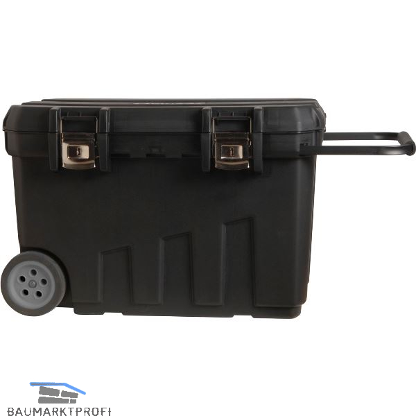 Mit Metallverschlüssen und herausziehbarem Handgriff. Zwei V-förmige Vertiefungen im Deckel zum Einlegen und Bearbeiten von Werkstücken, zwei große Vollgummiräder für Stabilität und Sicherheit. Inkl. herausnehmbarer Ablage.
