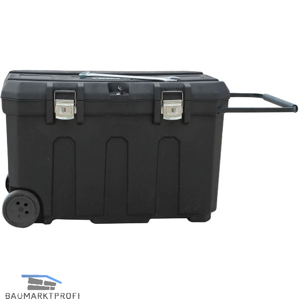 Extra große Montagebox mit Metallverschlüssen und herausziehbarem Handgriff. Zwei V-förmige Vertiefungen im Deckel zum Einlegen und Bearbeiten von Werkstücken, zwei große Vollgummiräder für Stabilität und Sicherheit. Inkl. herausnehmbarer Ablage.
