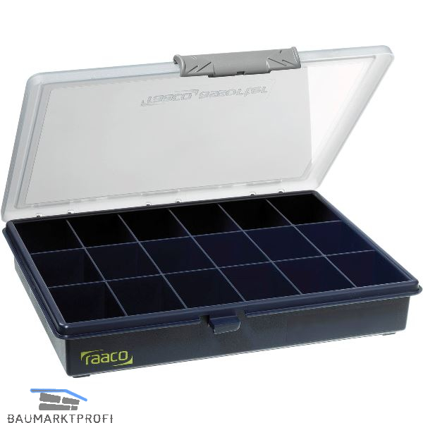 Sortimentkasten mit 18 festen Einteilungen gleicher Größe. Transparenter Deckel, stabile Schiebeverschlüsse.