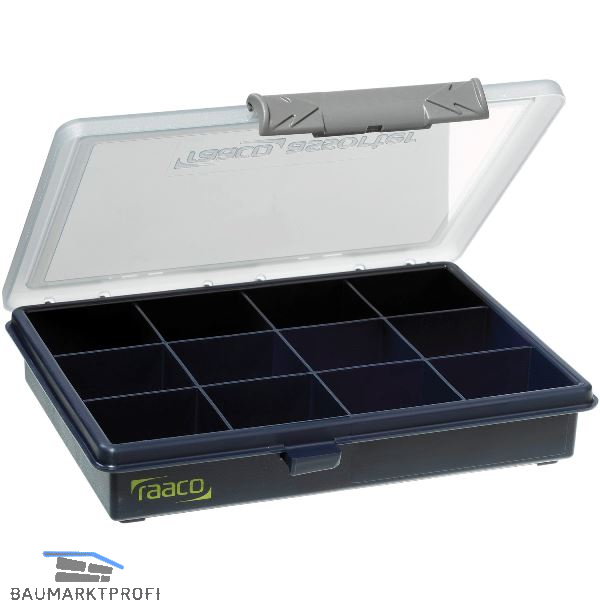 Sortimentkasten mit 12 festen Einteilungen gleicher Größe. Transparenter Deckel, stabile Schiebeverschlüsse.