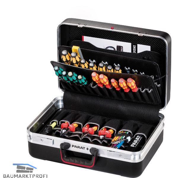 Kofferschalen aus X-ABS-Kunststoff, extrem schlagzäh, flugtauglich. Werkzeugtafeln aus Con-Pearl, schwarz, Doppel-Aluminiumrahmen, stabiler Griff mit Griffmulden, Kippzylinderschlösser, Rasterscharniere, Bodengleiter.