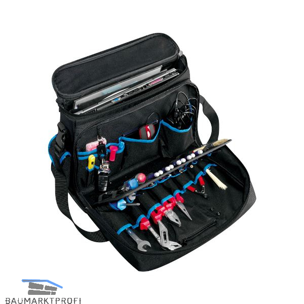 Ausstattung: gefütterte Innentasche für Laptop und DIN A4 Dokumente, mit herausnehmbarem Mittelteil und zusätzlichem mit Reißverschluss geschütztem Dokumentenfach, 8 Pockets und 1 kleine Tasche auf der Außenseite, 2 kleine und 5 große Pockets auf der Innenseite, Schlüsselringhalter, herausnehmbare Werkzeugtafeln mit 8 Pockets auf der Vorderseite, 2 Reihen elastische Schlaufen auf der Rückseite.