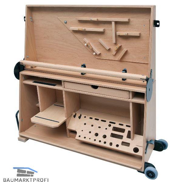 Robuste Werkzeugkiste mit großem Stauraum für das gesamte Handwerkzeug des Tischlers. Das Werkzeug ist immer übersichtlich und sicher verstaut! Die Box kann auch an der Wand aufgehängt werden. Ferner kann die Mobilo-Box durch den ausziehbaren Handgriff und das Fahrwerk bequem nachgezogen werden. Eine Aufhängeleiste gehört zum Standard-Lieferumfang.