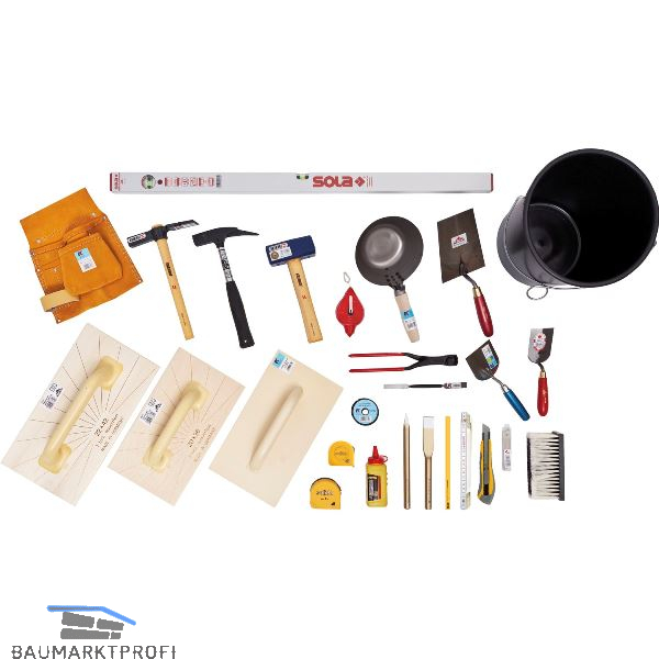 Werkzeuge in idealer Zusammenstellung für den Bau- und Maurerlehrling.
