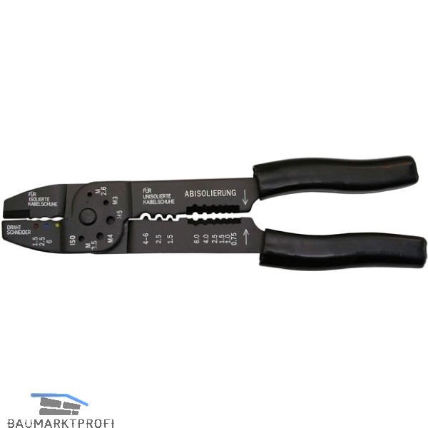 Für isolierte und nicht isolierte Kabelschuhe und Verbinder von 1,5 - 6 mm², Schraubenabschneider mit Gewinde für Schrauben M 2,6 - M 5, Kabel- und Drahtabschneider, Abisoliervorrichtung. Abisolierbereich: 0,75-6,0 mm