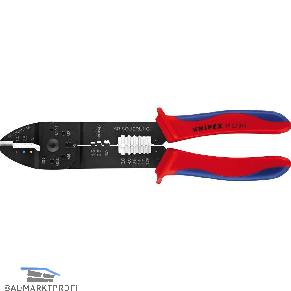 Zum Kabelschneiden, Abisolieren von Drähten und Crimpen von isolierten und unisolierten Kabelschuhen, Steckverbindern und offenen Steckverbindern. Mit Gewindelöchern zum Abschneiden von Cu- oder Ms-Gewindestiften mit M 2,6; M 3; M 3,5; M 4 und M 5. Geschraubtes Gelenk für eine hohe Stabilität und gleichmäßigen Lauf.