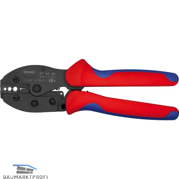 Gleichbleibend hohe Crimpqualität durch Präzisionseinsätze und Zwangssperre (entriegelbar). Crimpdruck ist werkseitig präzise eingestellt (kalibriert), nachstellbar. Kraftverstärkung durch Kniehebel für ermüdungsarmes Arbeiten. Gutes Handling durch günstige Griffstellung, geringes Gewicht, kurze Bauform und ergonomisch geformte Griffe. Mit Öffnungsfeder.