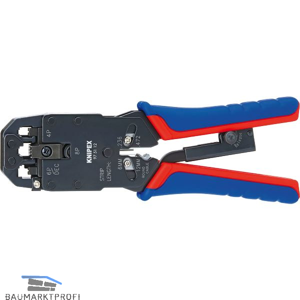 Profiwerkzeug zum Schneiden und Abmanteln von flachem, nicht abgeschirmtem Telefonkabel. Zum Verpressen von 4-, 6- und 8-poligen Westernsteckern Typ RJ 10 (7,65 mm breit) Typ RJ 11/12 (9,65 mm breit) und Typ RJ 45 (11,68 mm breit). Exakter Crimpvorgang durch Parallelcrimp. Gleichbleibend hohe Crimpqualität durch Zwangssperre (entriegelbar). Kraftverstärkung durch Kniehebel für ermüdungsarmes Arbeiten. Mit Längenabschneider und Abmantelungsmesser für Flachkabel mit 6 und 12 mm Länge. Mit zusätzlicher Abisolier-Funktion für Rundkabel. Mit Öffnungsfeder.